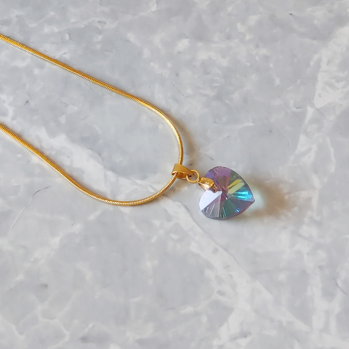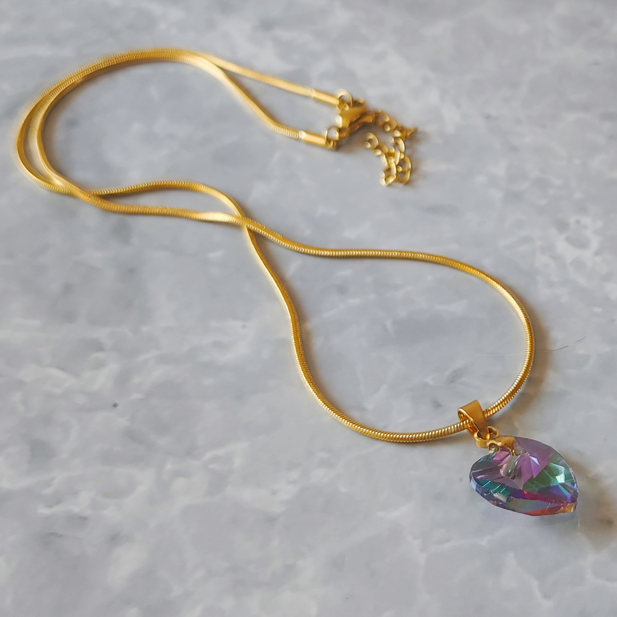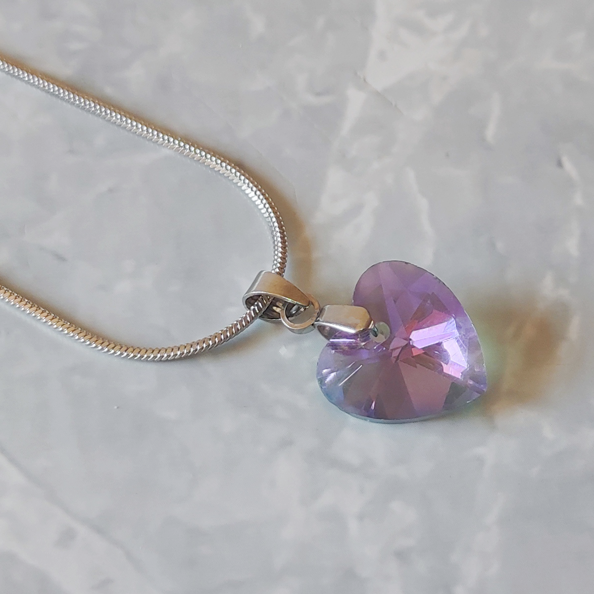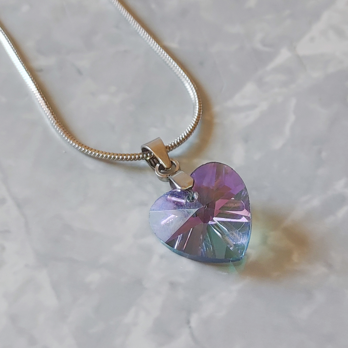 Este corazón de cristal facetado (1.5 cm) es la máxima expresión del misterio. Su brillo tornasolado captura la luz para revelar una hipnótica mezcla de azul profundo y morado vibrante, colores que evocan la tranquilidad del cielo a medianoche y el aura del enigma. Es una joya diseñada para quienes llevan la sofisticación en el alma.