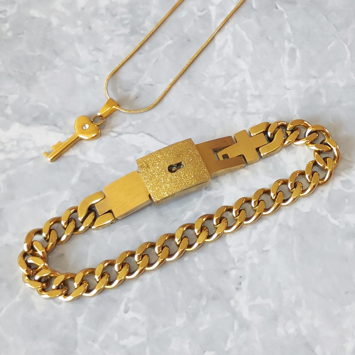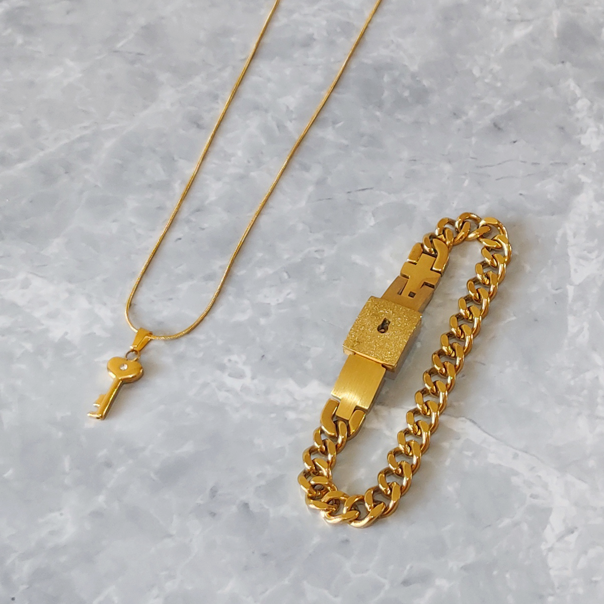 El concepto es tan romántico como atemporal: la Pulsera de Alta Confianza (para Él) solo puede ser abierta por el Collar con Llave del Corazón (para Ella). Es un ritual de amor que asegura que, no importa la distancia, siempre estarán unidos.